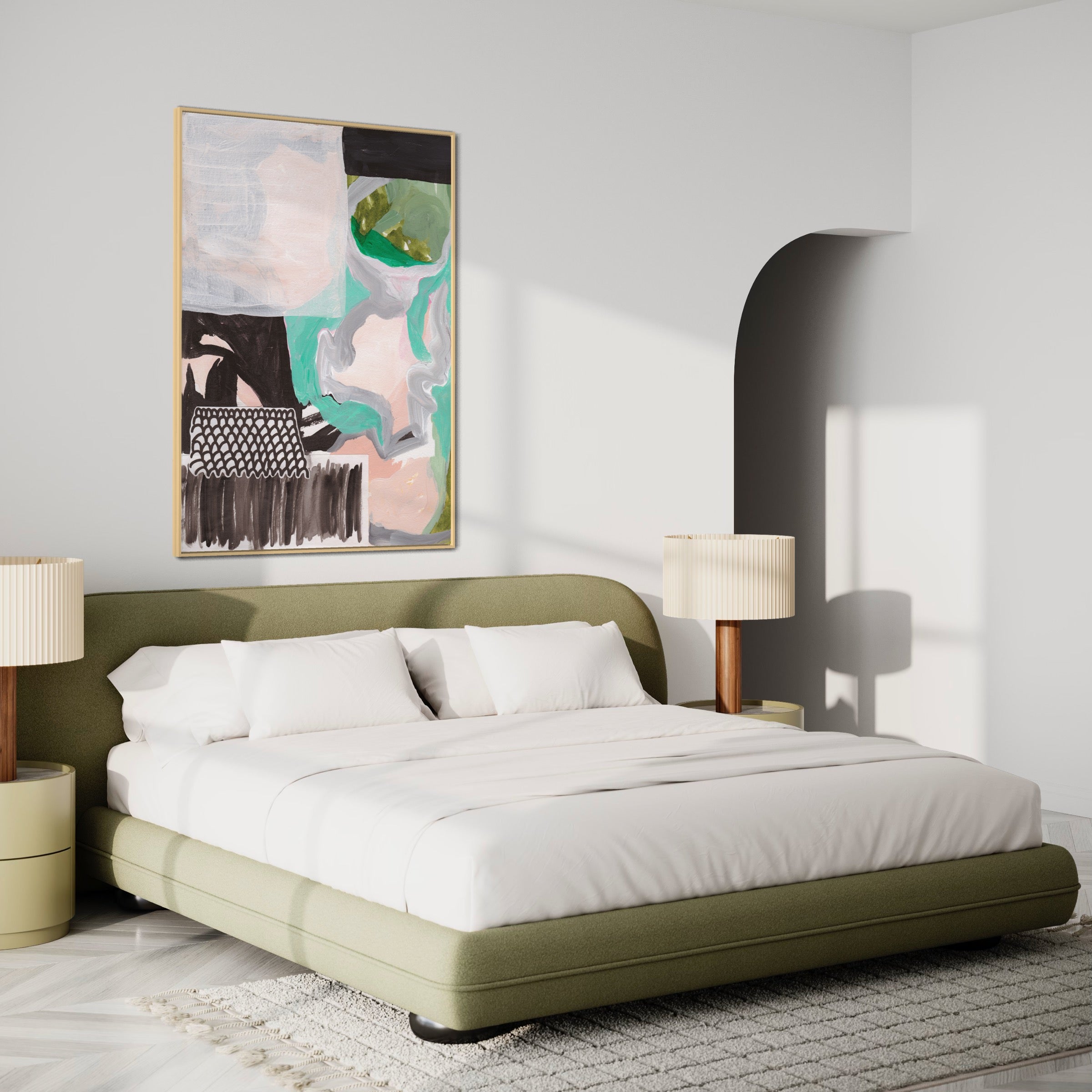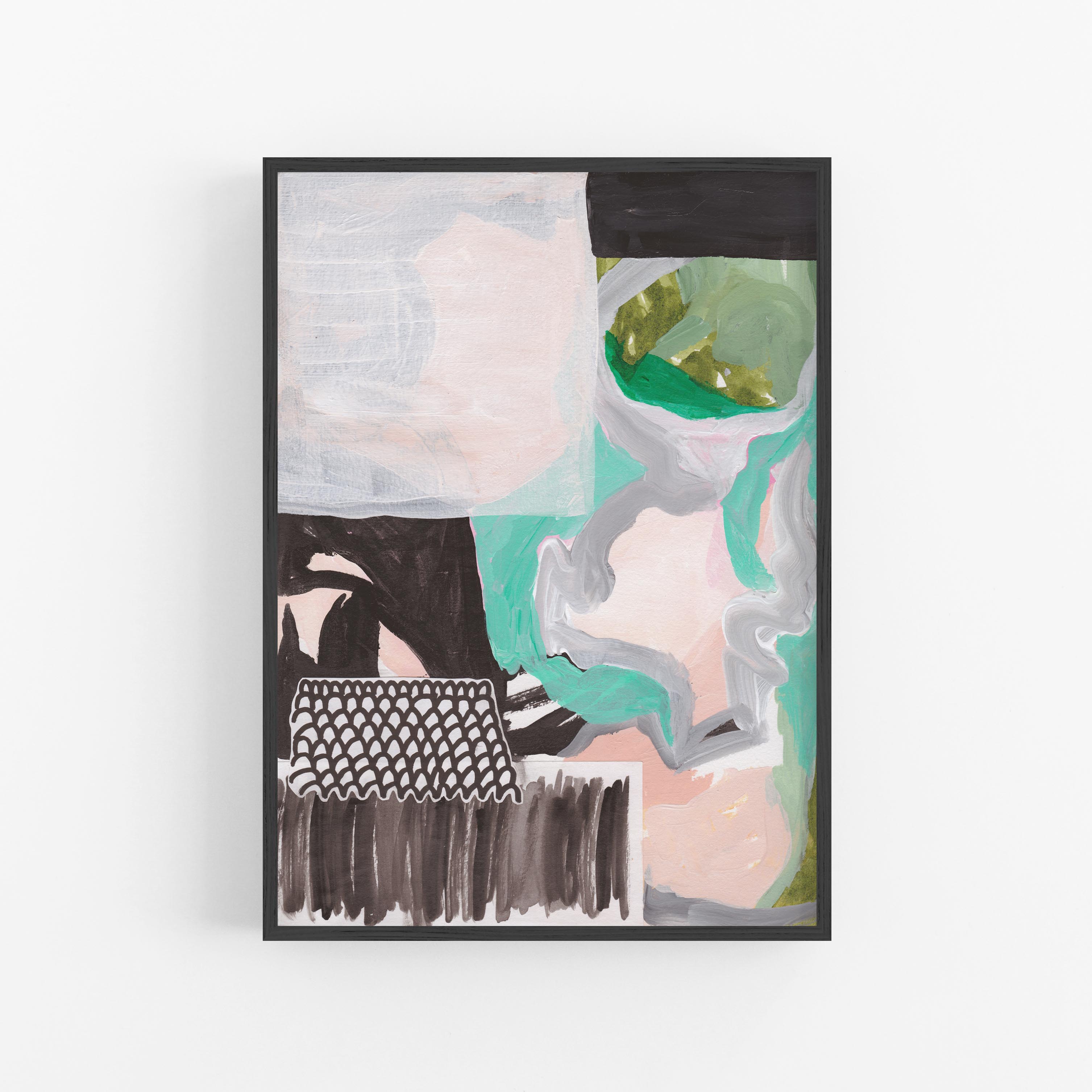 'Serenade of Growth' blends soft green and beige tones with deep black accents. The contrast makes it bold yet calming — a piece that feels like strength and softness growing side by side. A reminder that growth often comes from embracing both light and shadow.