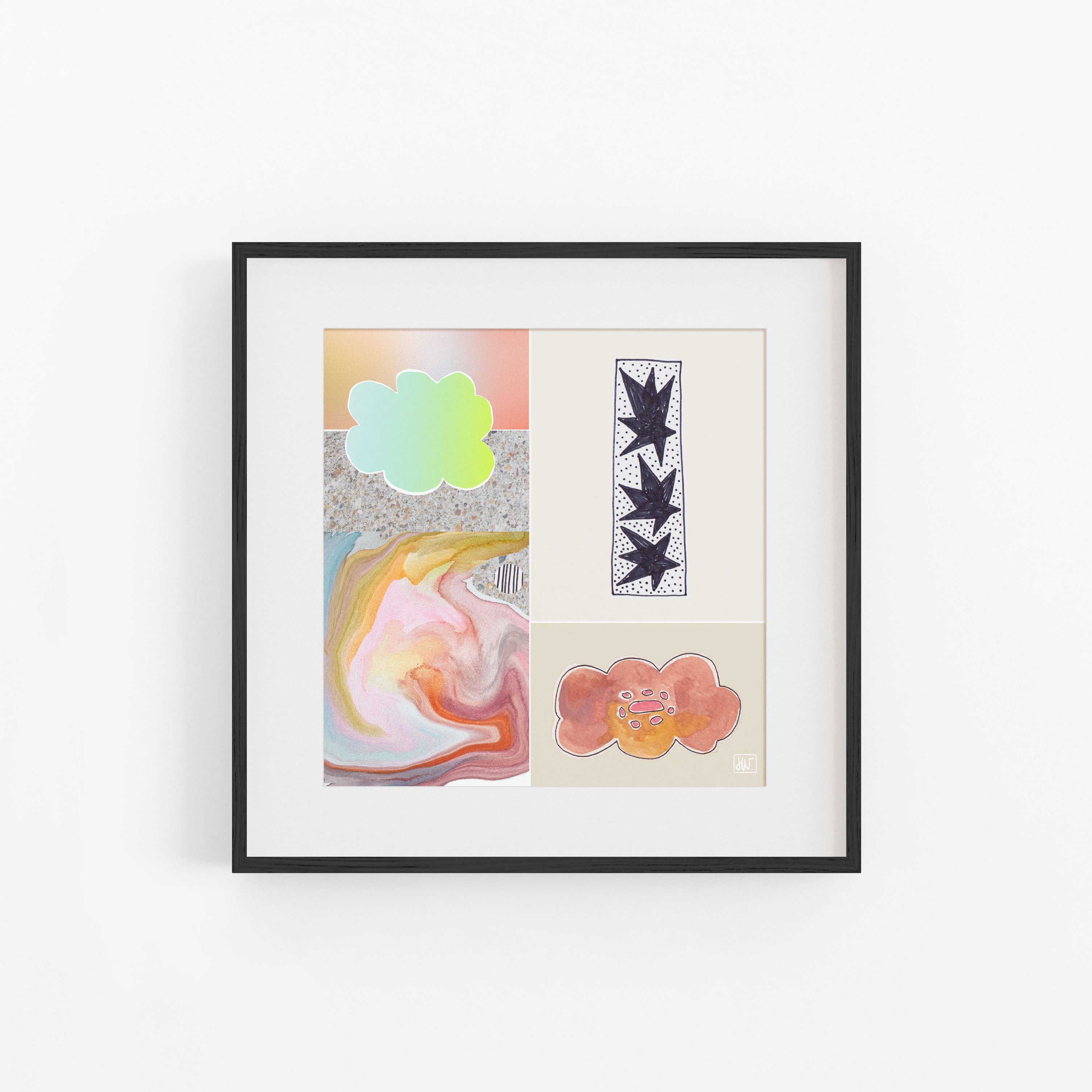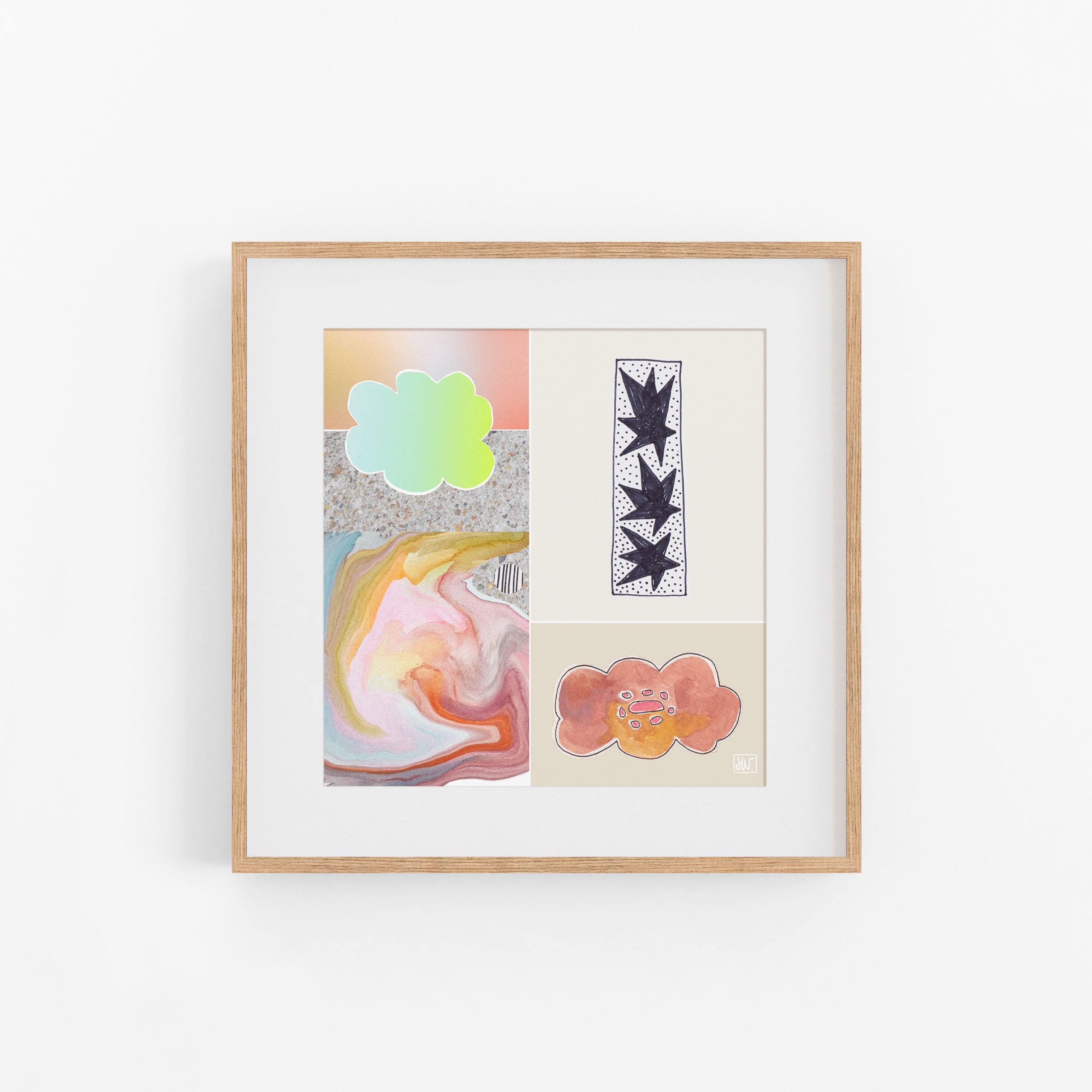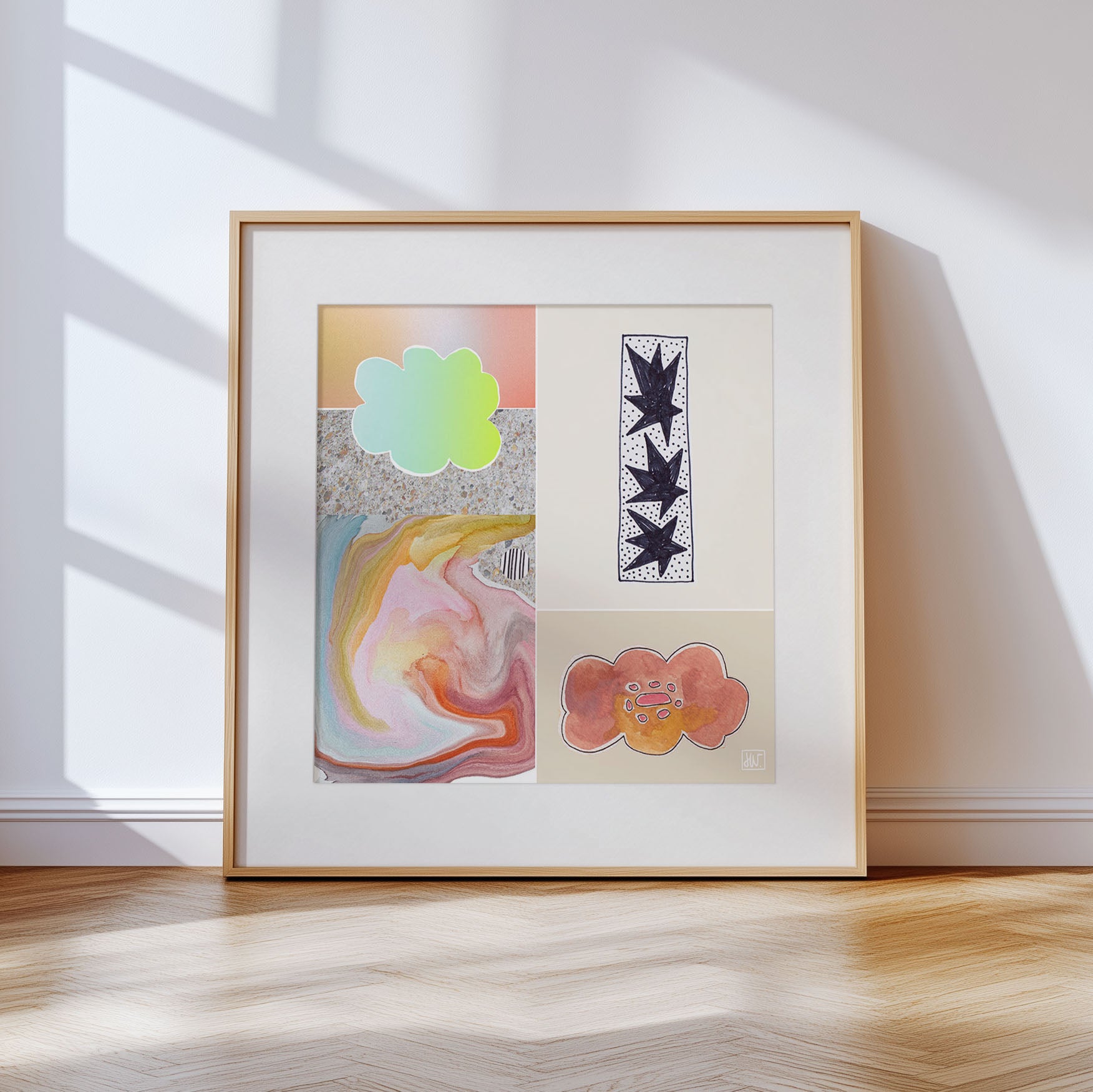 'Soft Cosmos' is pastel and dreamy with neon sparks — scribbled stars, a watercolor flower and that playful cosmos vibe that feels like drifting off into another world. It’s soft, light and a little whimsical, made to wake up your inner child and give your walls that dreamy sense of infinite space.