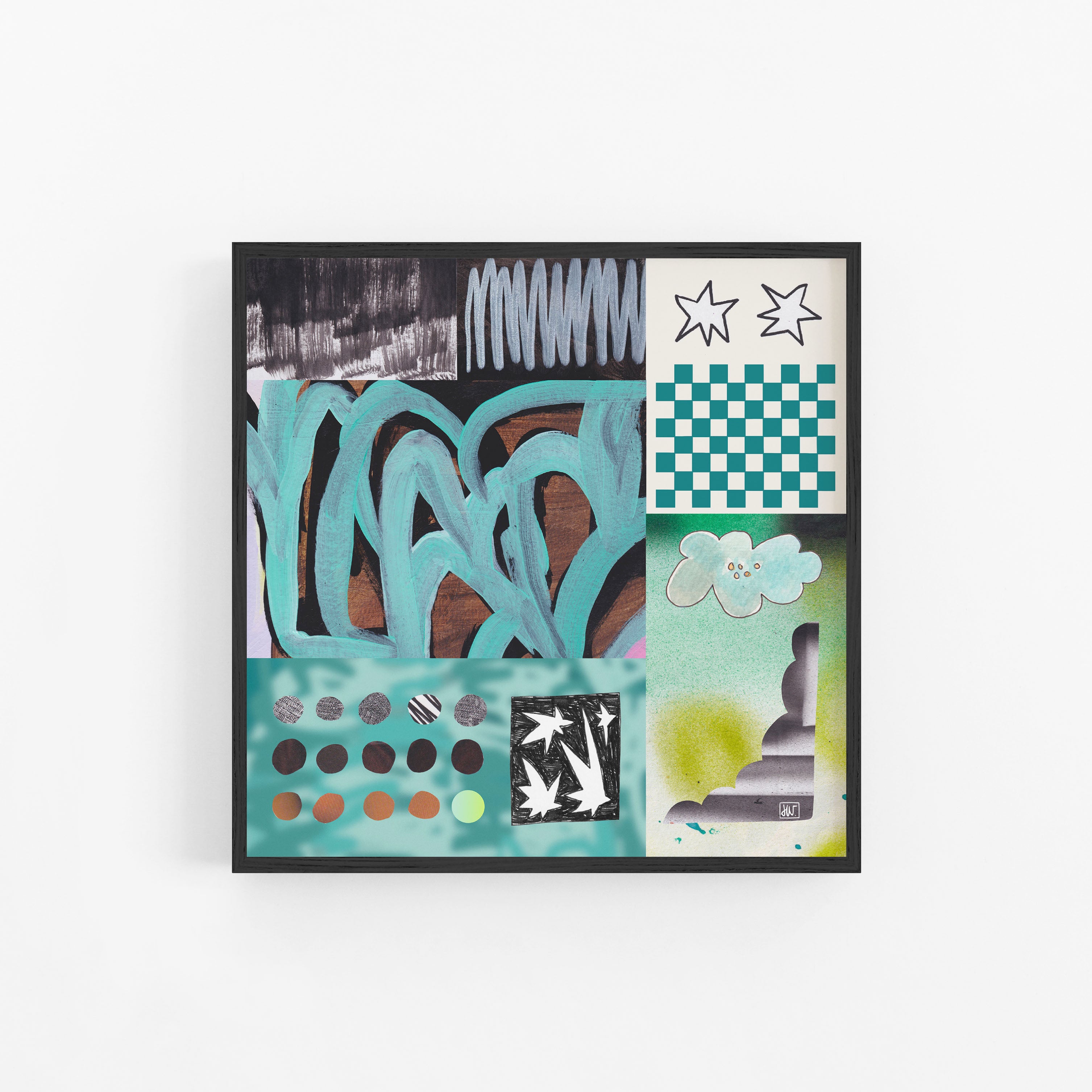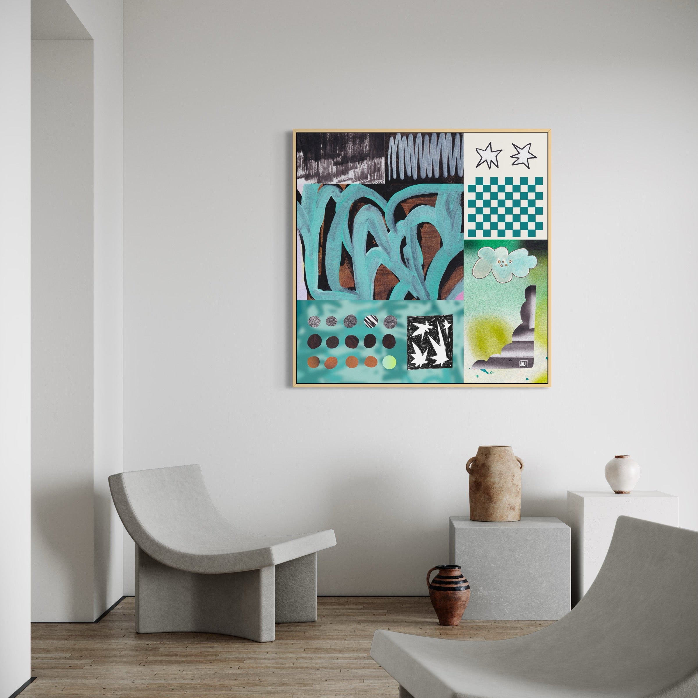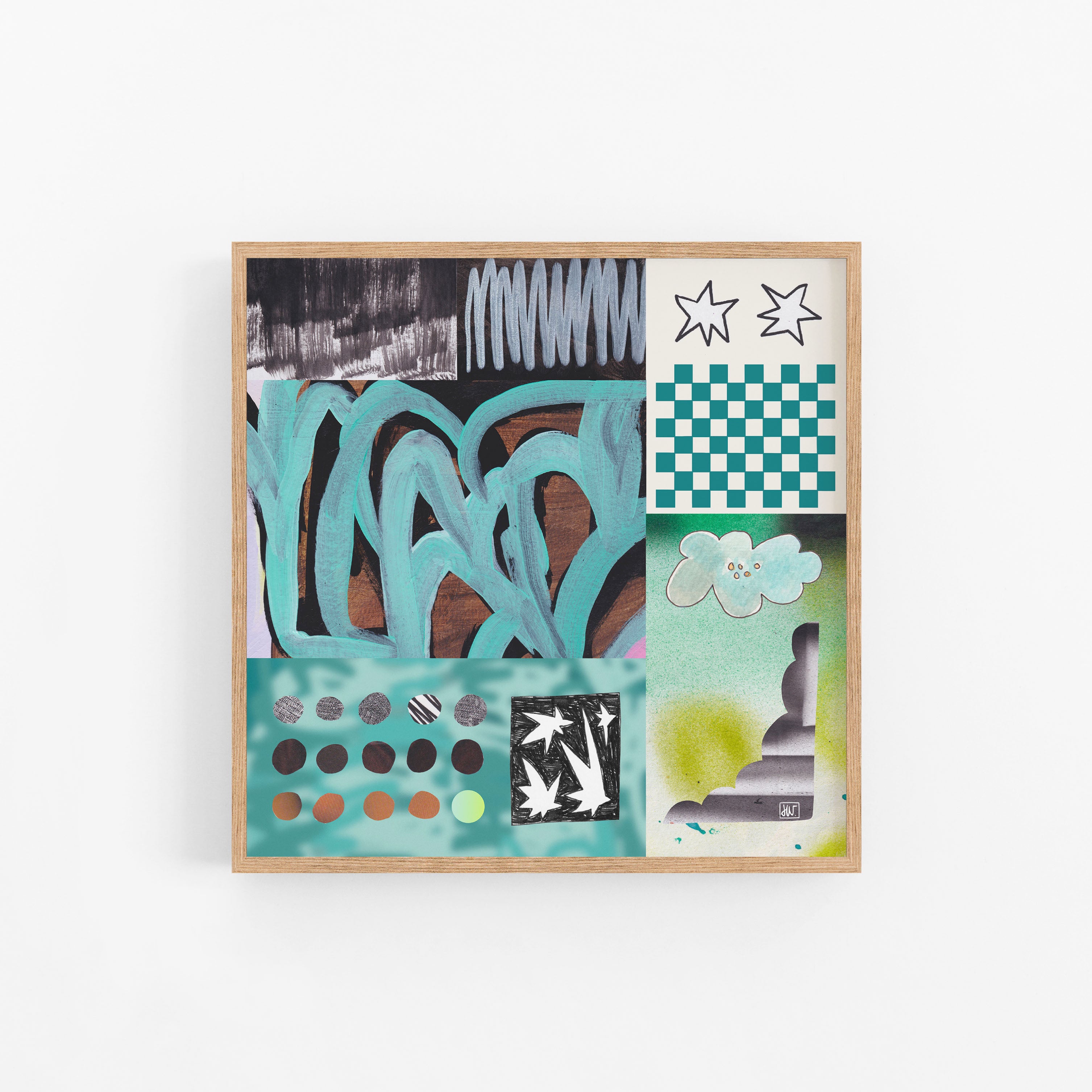 'Playful Shift' Dit is een werk uit de Transformative Teal serie. Geïnspireerd op vrijheid, zelfexpressie en de connectie met je innerlijke kind. De werken ontstaan intuïtief, als een mix van handgemaakte elementen zoals aquarel, airbrush en collage, gecombineerd met digitale lagen. Geen vast plan, wel gevoel.